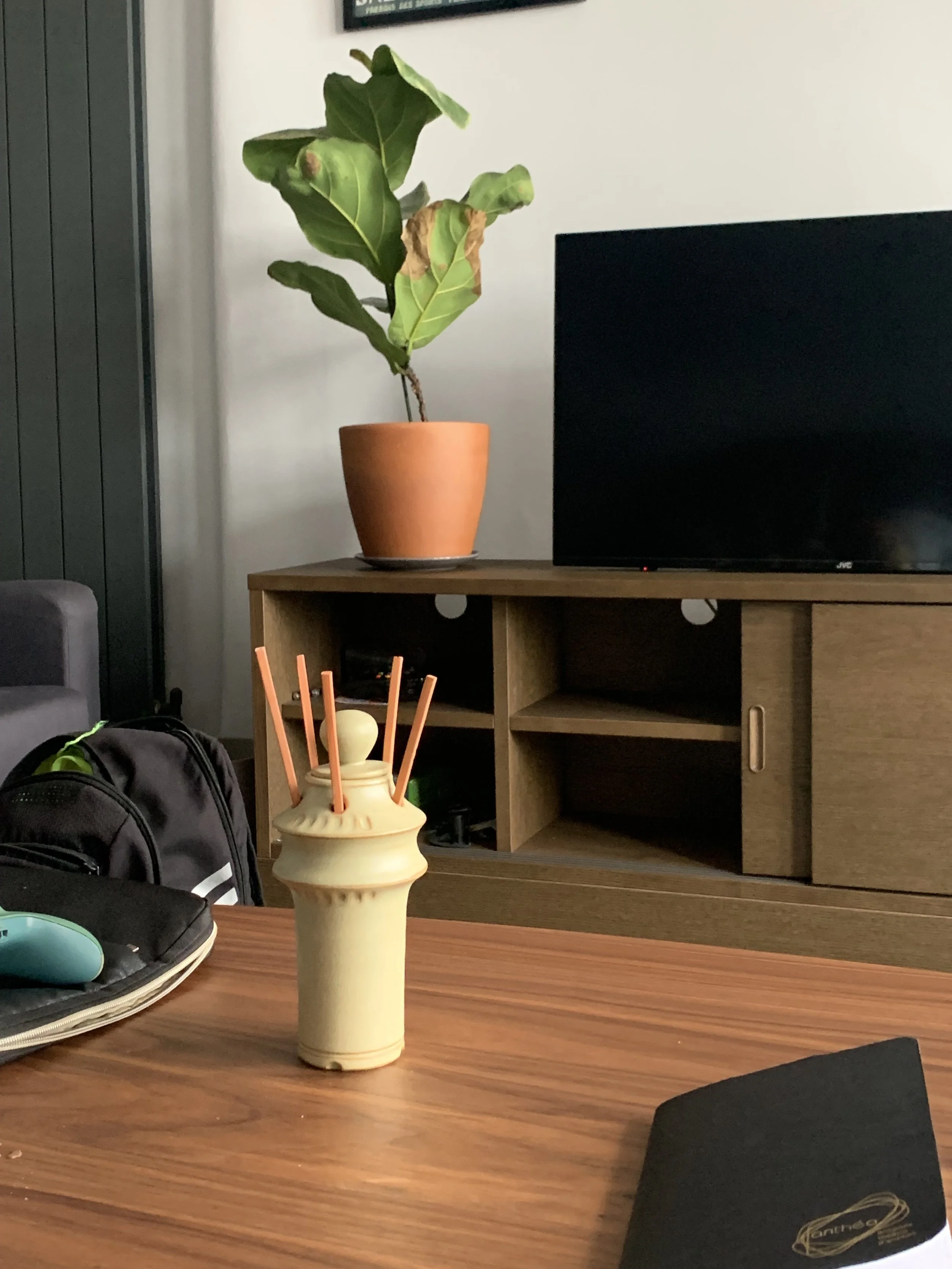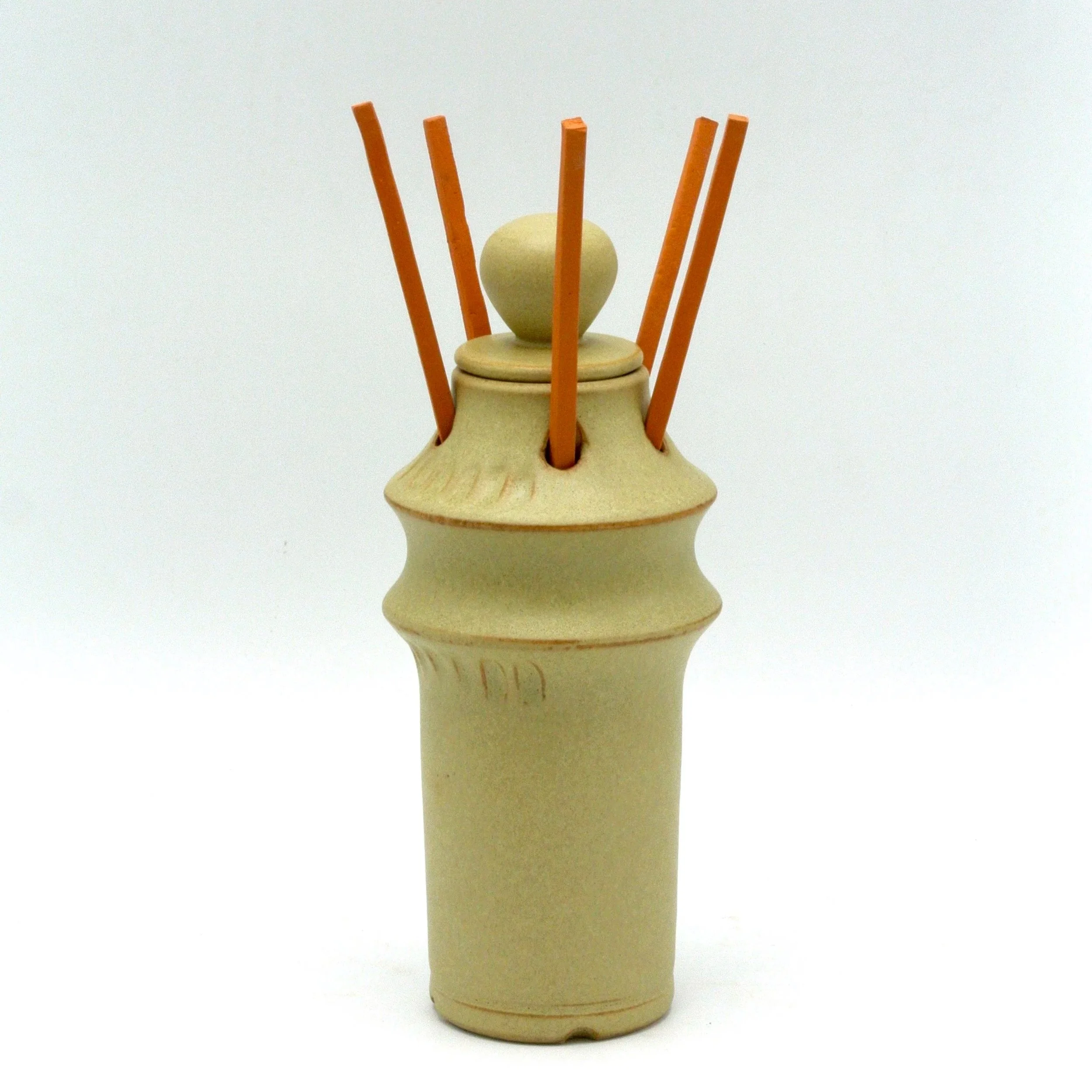 Created as part of my graduation project, this piece holds a story, but is designed to welcome yours as well. Each diffuser is wheel-thrown in stoneware and glazed in a custom satin green finish, paired with earthenware sticks, making every piece truly unique.